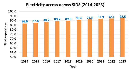 The trend of adopting renewable energy technologies across SIDS, continues to evolve and increase at different paces. The cumulative installed RE capacity increased substantially from 2014 to 2024, rising from 3.3 GW to 9.4 GW. Solar energy exhibited a remarkable increase, growing from 0.36 GW in 2014 to 5.4 GW in 2024. Wind power capacity also grew, doubling from 0.41 GW in 2014 to approximately 1.0 GW in 2024. This accelerated deployment of renewable energy in SIDS underscores their commitment to a just and equitable energy transition for sustainable development and climate resilience.